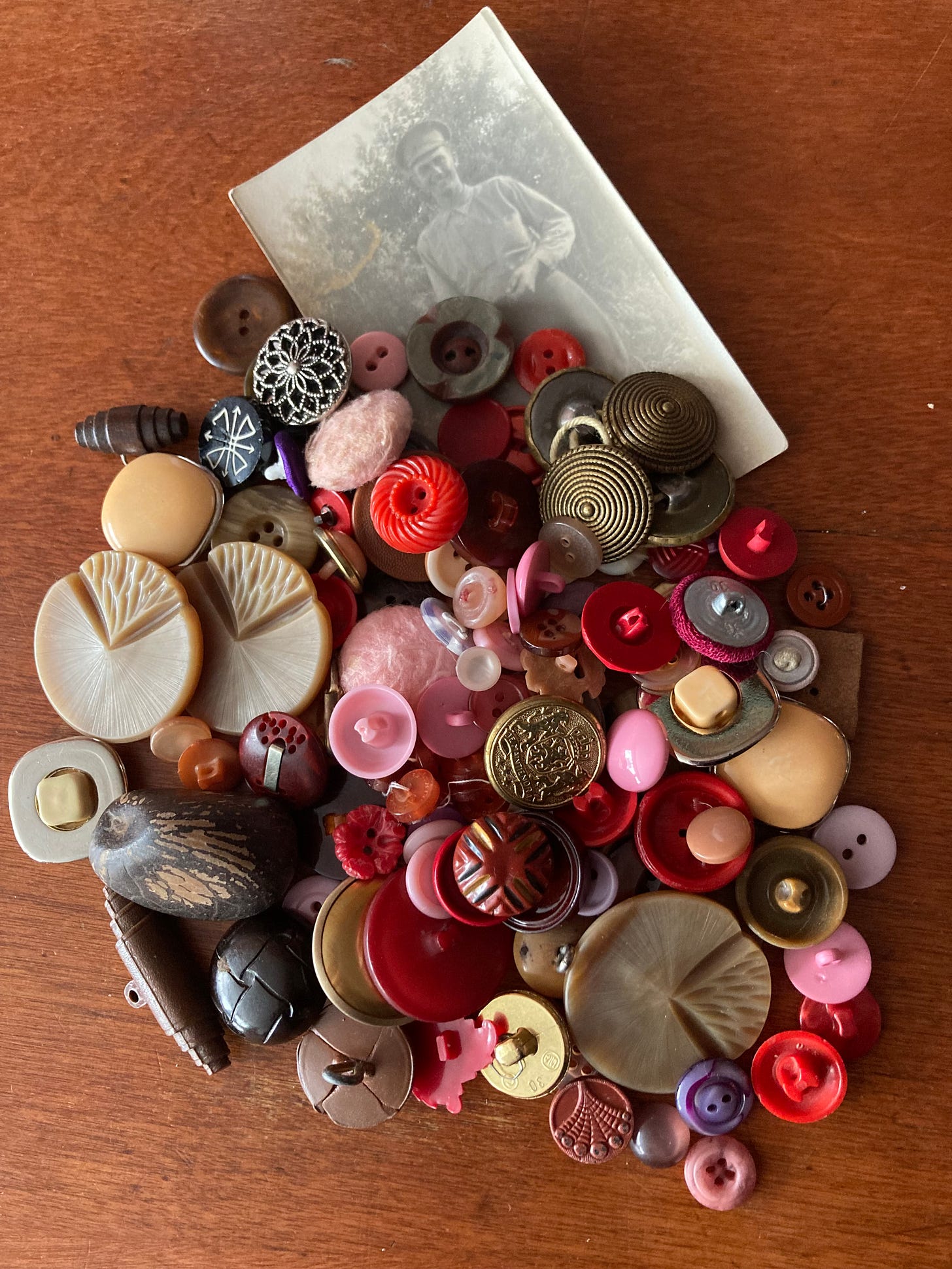 There were five pink fuzzy buttons from Grandma Coffey’s housecoat, replaced when her daughters bought her a new green one for Christmas. And the tiny white pearl ones that I pretended were puppy teeth. The six leather-covered ones were from my Uncle Fred’s jacket, which he ruined at a party when he was “young and foolish” according to my grandma. Uncle Fred later became a bank manager and could afford as many leather-covered buttons as he wanted. I sorted my mountain of buttons into piles by size and colour. Then I placed my whole face into the empty box and inhaled the delicious scent of earth and musty wood.