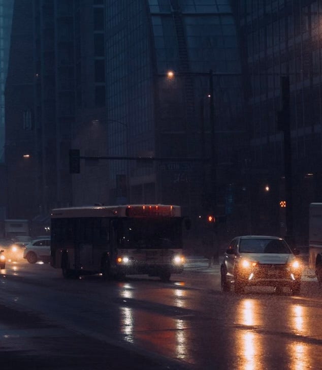 Air brakes screech, doors creak, leaky raincoats squeeze in -